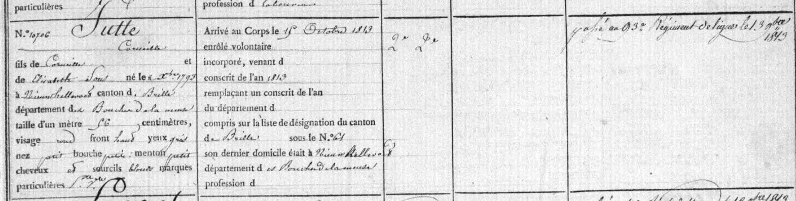 De stamboeken (militaire personeelsregisters) uit de Napoleontische tijd worden bewaard in het Service Historique de la Défense in het Château de Vincennes bij Parijs.1Een wegwijzer om te zoeken vind je bij Uit de oude koektrommel, een site van Tanja Enklaar. Zelf heb ik ook dankbaar gebruik gemaakt van de namenlijsten op de site van John van Eekelen. Deze stamboeken bevatten gedetailleerde persoonlijke gegevens van dienstplichtigen en soldaten, zoals naam, geboorteplaats, woonplaats, lotingsnummer, eenheid, identificatienummer, fysieke kenmerken, carrièreverloop en soms lotgevallen.