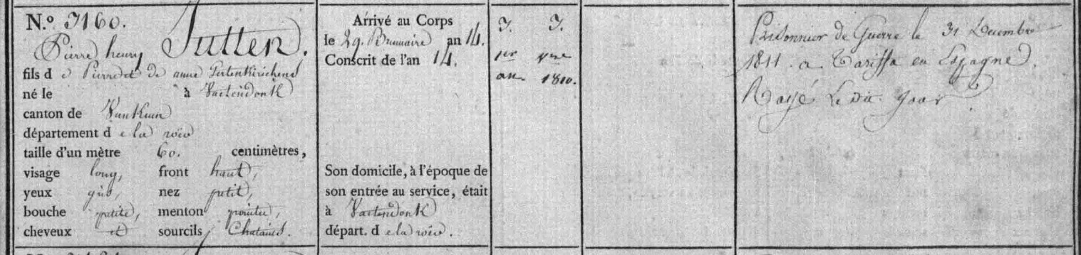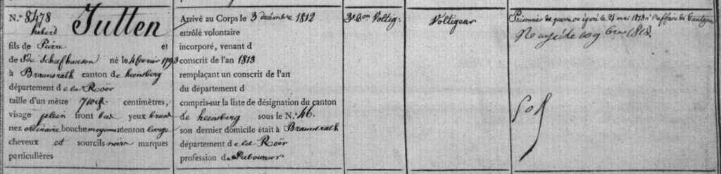 Op 1 februari 1804 (11 Pluviôse jaar XII) wordt de dienstplichtige Heinrich Jütten ingeschreven in het stamboekregister van het 51e Regiment Infanterie van Linie en ingedeeld bij het 1e bataljon, 7 compagnie. Op 7 november 1804 (19 Brumaire jaar XIII) volgt overplaatsing naar het 3e bataljon, 8e compagnie. In die tijd is hij gelegerd in het kampement te Brugge.4Wikipedia, Réorganisation des corps d’infanterie français (1803). Op 24 april 1805 (4 Floréal jaar XIII) wordt hij krijgsgevangen genomen. Waar en hoe dat precies is gebeurd, is onbekend. Waarschijnlijk komt hij later door een gevangenenruil weer vrij. Hij keert terug naar Selsten en woont in 1812 weer bij zijn moeder. Hij overlijdt daar op 20 mei 1846.